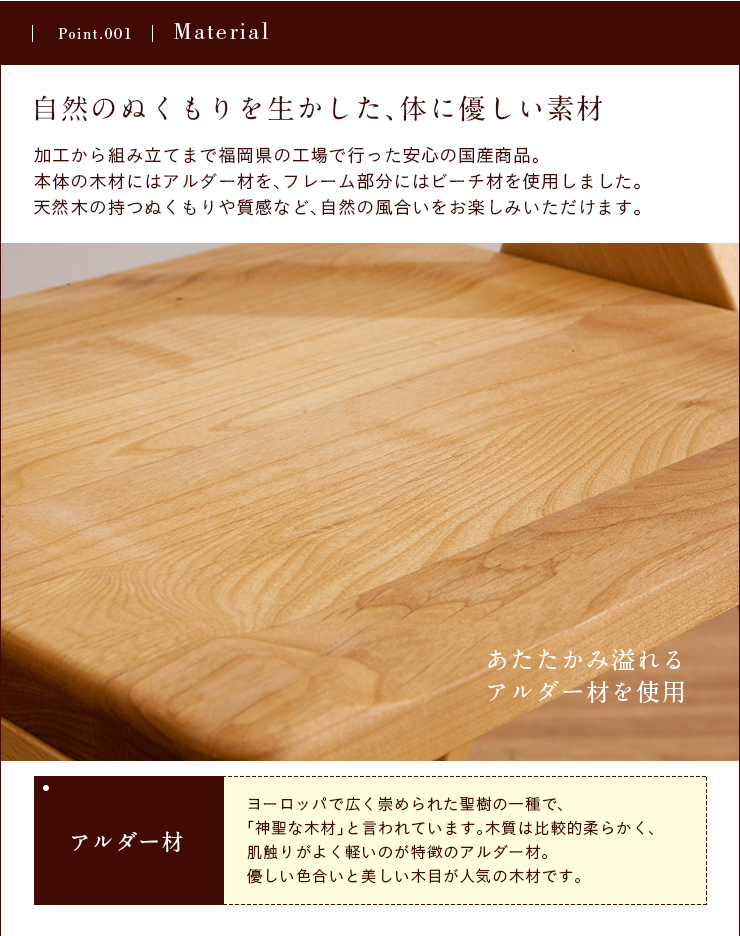 材質:天然木アルダー材、天然木ビーチ材、ポリエステル 100%